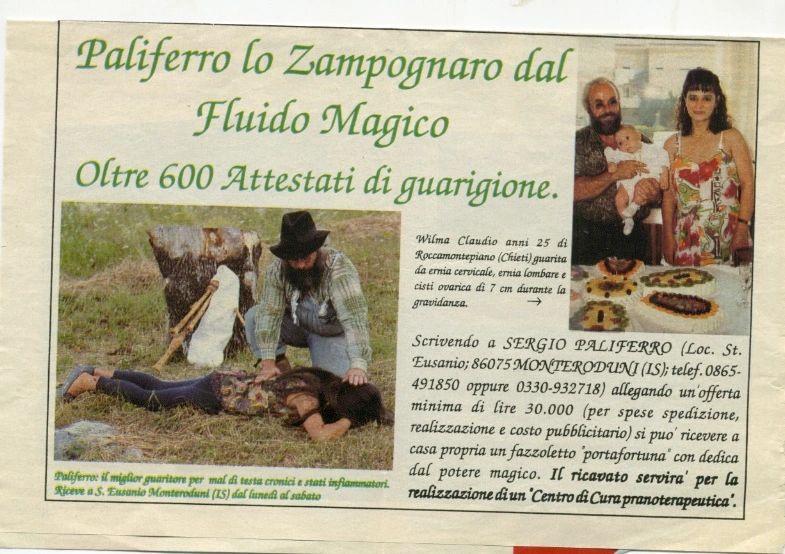 La leggenda narra che in Arcadia, il leggiadro pastorello Paliferro atterrò prima a bastonate una dolce fanciulla e, rapito dalla sua bellezza, suonò il flauto e la spina dorsale della fanciulla magicamente ritornò integra. Poi arrivarono i carabinieri e l’incanto si spezzò. Come il sogno di costruire un centro di pranoterapia da tre miliardi un trentalilalire alla volta.